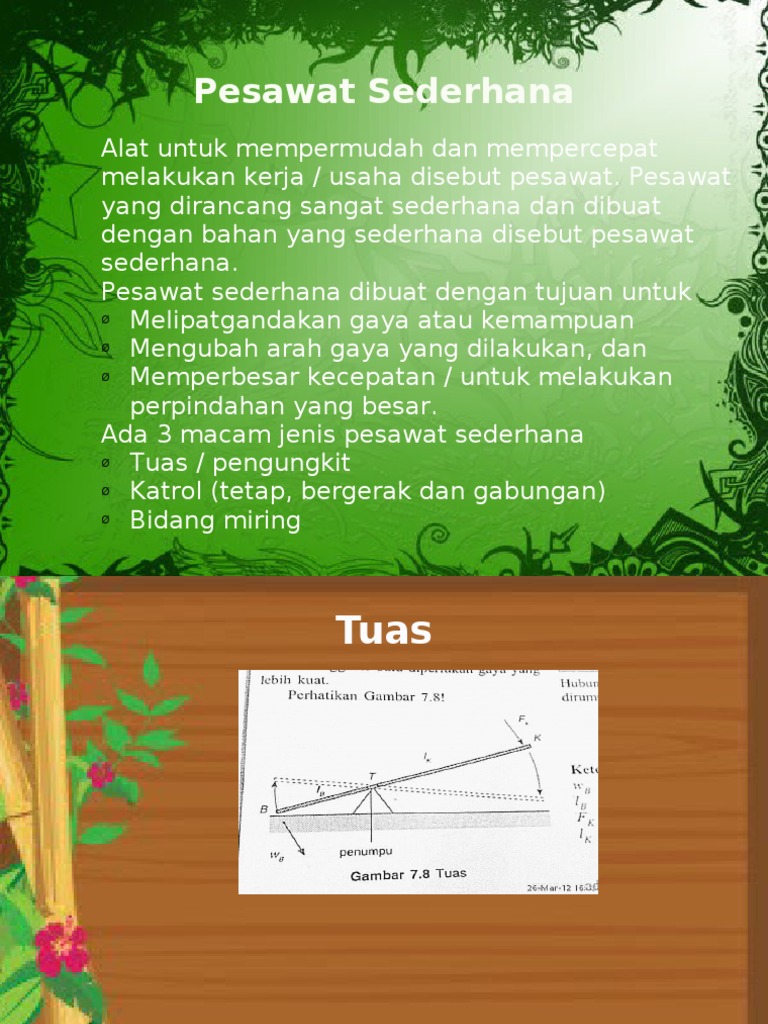 Pesawat sederhana dapat dibedakan menjadi beberapa macam antaralain, tuas/pengungkit, katrol, roda, dan bidang miring. 5 tuas / pengungkit adalah batang yang digunakan untuk mengungkit titik tumpu : Tuas/pengungkit, katrol, bidang miring, dan roda berporos/ roda bergandar. Pesawat sederhana adalah alat bantu untuk memudahkan kerja atau usaha. Tuas tujuan percobaan setelah melakukan percobaan inisiswa diharapkan dapat: